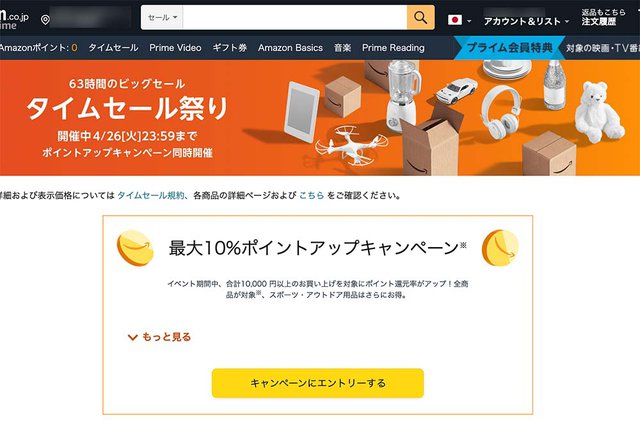 さらに言えば、Amazonにも楽天ほどではないがポイント制度はある。「タイムセール祭り」ではポイントアップキャンペーンも開催されており、期間中に合計10,000円以上の注文をすることで、最大10%のポイント(付与上限は5,000ポイント)が還元されるのだ。