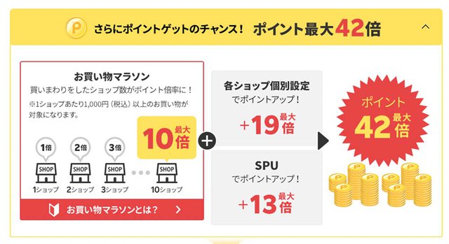 また、今回のセールで欲しい商品の数があまりない場合、「タイムセール祭り」が結果的にお得な可能性が高い。「お買い物マラソン」は複数店舗での「買いまわり」でポイント最大10倍が付与されるが、逆に言えばそこまで買うものがなければ、この制度でのポイントは数倍止まりになる。