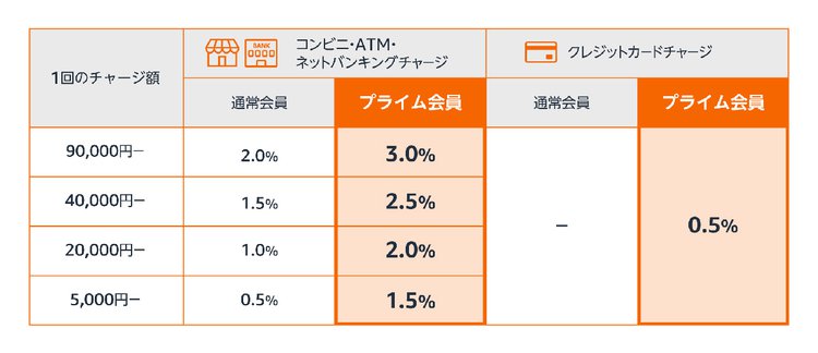 チャージ方法によって還元率が異なり、現金でチャージする場合、プライム会員なら最大3%の還元を受けることができる。なお現金でのチャージは、コンビニやATMのほか、ネットバンキングも可能。対応するネットバンクの口座があれば、チャージのために外出する必要はない。一方でクレジットカードでも、プライム会員であれば0.5%が還元される。