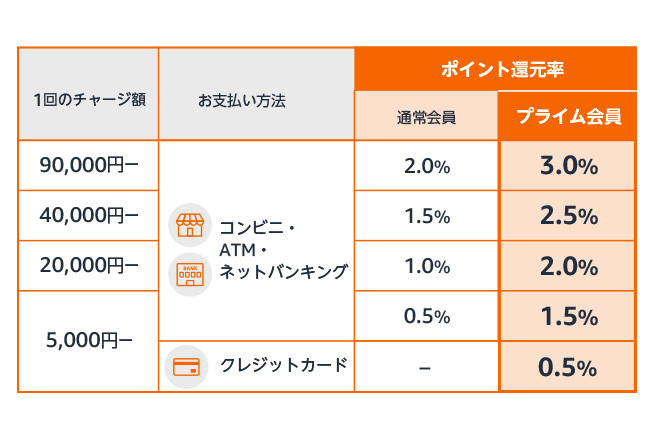 チャージ方法によって還元率が異なり、現金でチャージする場合、プライム会員なら最大3%の還元を受けることができる。なお現金でのチャージは、コンビニやATMのほか、ネットバンキングも可能。対応するネットバンクの口座があれば、チャージのために外出する必要はない。一方でクレジットカードでも、プライム会員であれば0.5%が還元される。