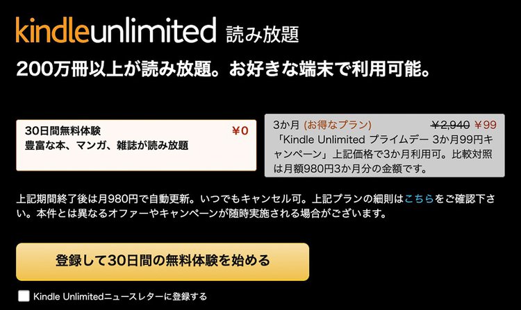 7月12日(火)・13日(水)に開催される「Amazonプライムデー」と連動したキャンペーン。プライム会員かつ日本国内在住で、過去6ヶ月以内に無料体験やキャンペーンを利用していないユーザーを対象に、月額980円のKindle Unlimitedが3ヶ月(通常2,940円)の間、99円で利用でき、200万冊以上が読み放題となる。自身が対象条件を満たしているかは、Kindle Unlimitedトップページの本プラン表示の有無で確認できる。