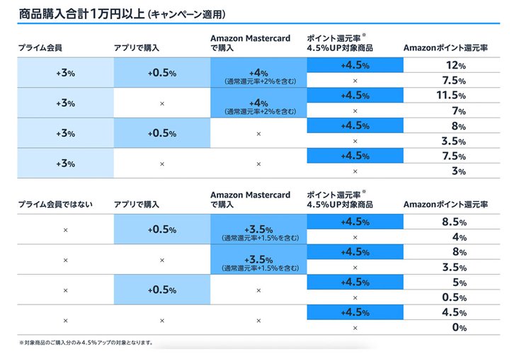 今回のプライムデーはポイントアップキャンペーンも太っ腹だ。全商品がポイントアップの対象となり、期間中、合計1万円以上を購入するとポイント還元率がアップする。条件にもよるが、通常商品は最大7.5%還元になり、Amazonデバイスはさらに4.5%アップ、つまり最大12%ポイント還元となる。Amazonデバイスはセール期間中、販売価格もかなり安くなるのだが、そこからさらにポイント還元が行われるのだ。