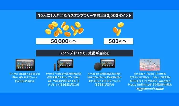 スタンプラリーキャンペーンでは、「Prime Videoの会員特典対象作品を観る」「Amazon Music Primeを聴く」「Prime Readingを読む」でそれぞれスタンプを獲得可能。そして、そのスタンプによって、Amazonデバイスや特別ライブのチケットが当たる抽選に参加できる。