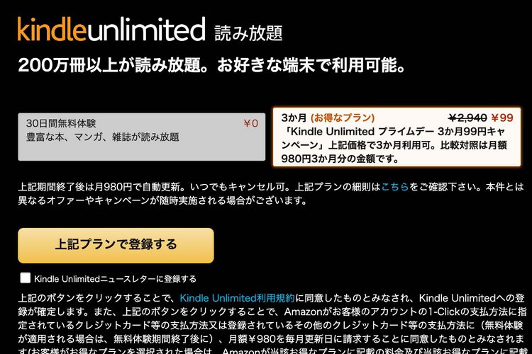 プライム会員かつ日本国内在住で、過去6ヶ月以内に無料体験やキャンペーンを利用していないユーザーを対象に、月額980円のKindle Unlimitedが3ヶ月(通常2,940円)の間、99円で利用でき、200万冊以上が読み放題となる。自身が対象条件を満たしているかは、Kindle Unlimitedトップページの本プラン表示の有無で確認できる。