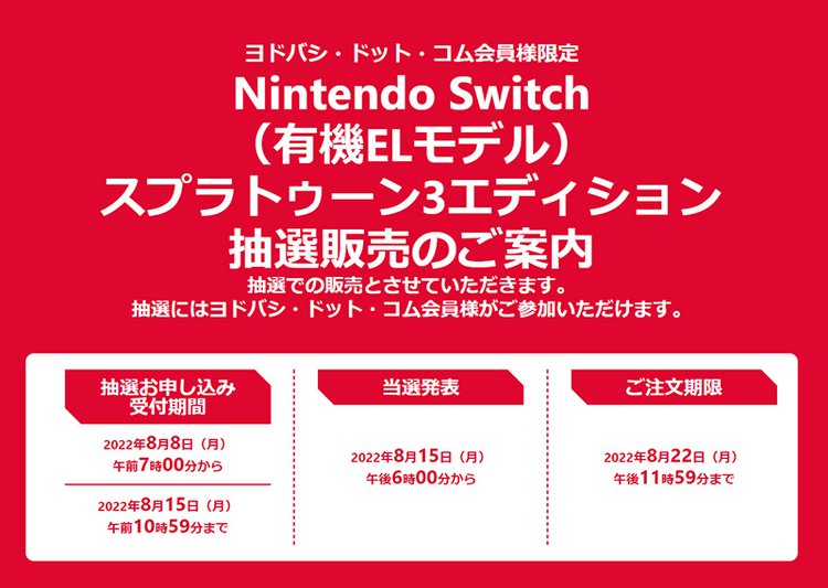 ヨドバシ・ドット・コムは、「Nintendo Switch(有機ELモデル)スプラトゥーン3エディション」の抽選申し込みを8月8日(月)7時より開始する。抽選申し込み期間は8月15日(月)10時59分まで。