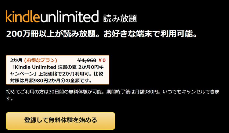 Amazonの読み放題サービス「Kindle Unlimited」が、2ヶ月0円で利用できる「読書の夏キャンペーン」を実施している。期間は8月31日まで。