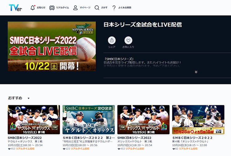 東京ヤクルトスワローズとオリックス・バファローズが今季の頂点を賭けて争うプロ野球「SMBC日本シリーズ2022」が、いよいよ本日、10月22日(土)に開幕する。テレビ放送のほか、インターネット配信でも生中継が視聴可能だ。本記事では、無料で視聴できるテレビ放送およびネット配信の状況をまとめてみた。