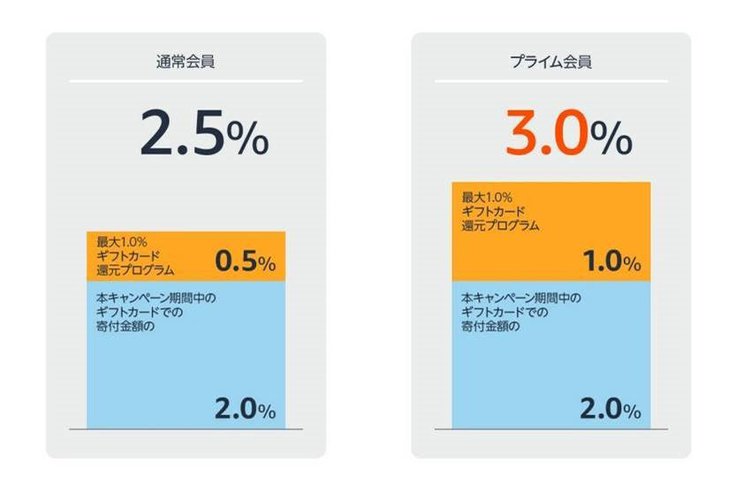 なお、最大3%還元の内訳は、本キャンペーンの2%と「最大1.0%ギフトカード還元プログラム」の還元率の合計値となり、プライム会員は最大3.0%、通常会員は最大2.5%。また、最大1.0%ギフトカード還元プログラムと本キャンペーンの還元のタイミングは異なる。