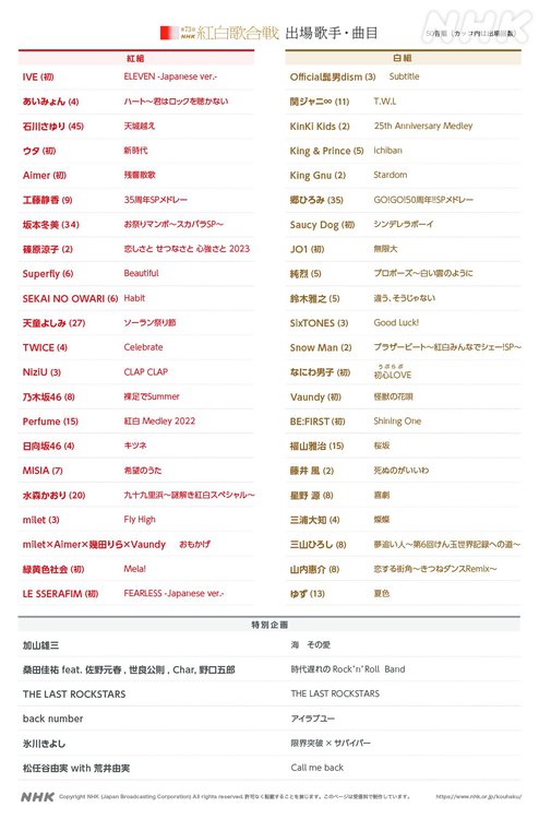 12月31日に放送される年末の恒例番組「第73回NHK紅白歌合戦」。これまでに出演者情報が続々と明らかにされてきたが、当日披露される曲目も決定した。NHK公式サイトで紹介されている見どころとともにお届けする。