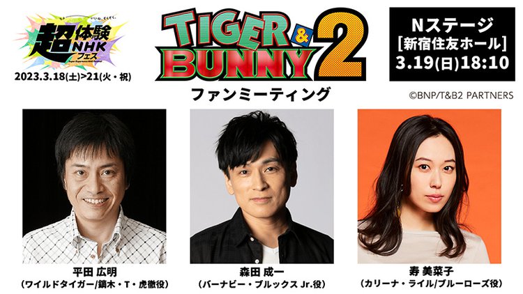 放送開始に先駆け、3月18日〜21日までNHKが開催するイベント「超体験NHKフェス」にて『TIGER & BUNNY 2』ファンミーティングも開催。ファンミーティングは3月19日18時10分からで、平田広明、森田成一、寿美菜子という主要声優キャストたちが収録秘話や見どころについてのトークショーを行う。