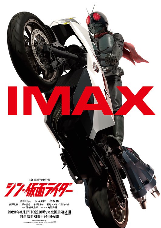 3月18日(土)から全国劇場で公開する映画『シン・仮面ライダー』のIMAX/4DX/Dolby Cinema/MX4D版の上映日が発表された。IMAXフォーマットでの上映は全国約40の劇場にて、本作の「最速公開日」である3月17日(金)の19時以降の上映回から行われる。東映配給の実写作品でIMAXによる公開は本作が初となる。