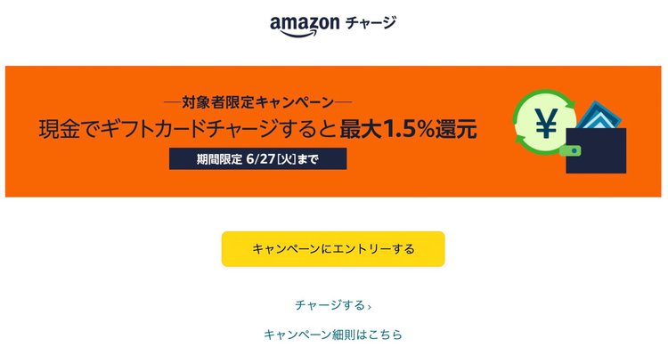 Amazonは、「Amazonギフトカード」を現金でチャージすることで最大1.5%還元されるキャンペーンを開催している。キャンペーン期間は6月27日までとなっている。
