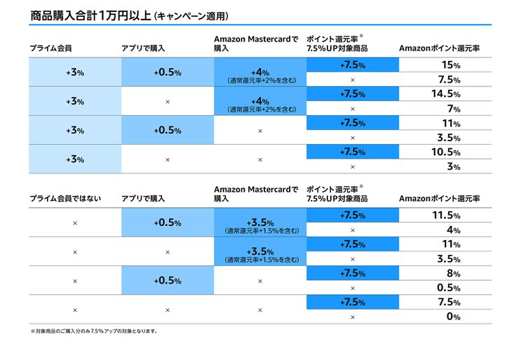 増えるポイントの内訳は、プライム会員なら+3%、Amazon Mastercardでの買い物なら最大+4%、Amazonショッピングアプリからの買い物で+0.5%、Amazonデバイスの購入で+7.5%。先行セール品を含む全商品が対象となる。以下のURLからエントリーできる。