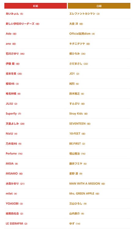 紅組では新しい学校のリーダーズ、Ado、ano、伊藤 蘭、MISAMOの5組、白組では大泉 洋、キタニタツヤ、すとぷり、Stray Kids、SEVENTEEN、10-FEET、MAN WITH A MISSION、、Mrs. GREEN APPLEの8組が初出場。初出場組を含む各出演者については「今年の活躍」「世論の支持」「番組の企画・演出」という3点を中心に検討のうえ、総合的に判断したという。