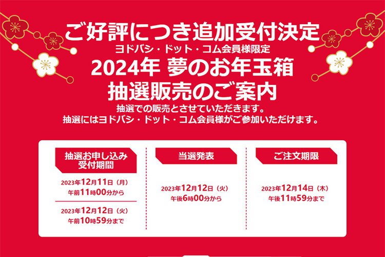 ヨドバシ・ドット・コムは、「2024年 夢のお年玉箱」の追加受付を決定。抽選への申し込みを12月12日10時59分まで受け付けている。