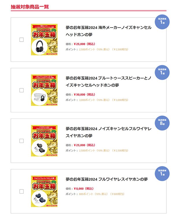 カメラ、スマートフォン、家電など各ジャンルごとに合計52種類の福箱を用意。例えばAV機器系では「ノイズキャンセルフルワイヤレスイヤホンの夢(25,000円)」「高音質フルワイヤレスイヤホンの夢(15,000円)」「サウンドバーの夢(20,000円)」など各種をラインナップしている。なお、通常商品同様に福箱も10%ポイント還元する。