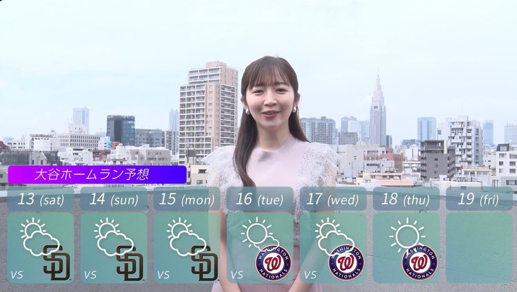 大谷翔平選手の出場試合ごとに、天気予報のようにホームランを打つ確率が高ければ晴れ、低ければ曇りや雨といったように表示する。予報を算出するため、スポーツテック企業「STATS PERFORM」とABEMAが共同開発した独自のシステムを活用する。