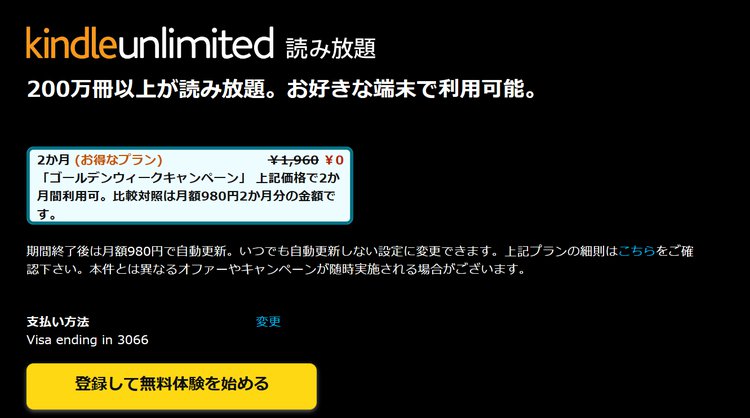Amazonは、200万冊以上の電子書籍が読み放題になる「Kindle Unlimited」を2ヶ月0円で利用できる「ゴールデンウィークキャンペーン」を実施している。キャンペーン期間は本日4月22日 23時59分までと、終了が迫っている。