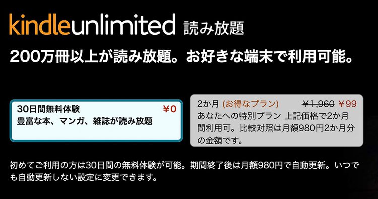 Amazonが提供する本、コミック、雑誌などの定額制読み放題サービス「Kindle Unlimited」。通常は1ヶ月980円の同サービスを、2ヶ月99円で利用できる「あなたへの特別キャンペーン」が開催されている。