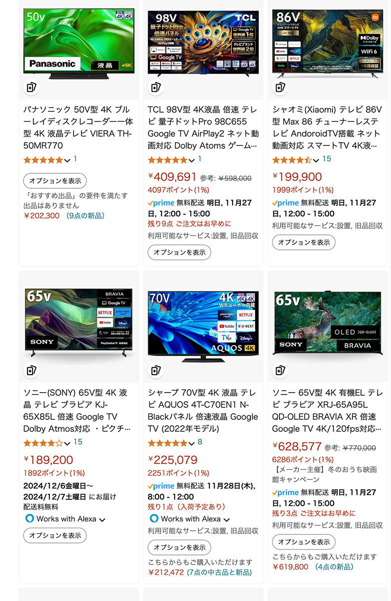 キャンペーンの対象となるのは、商品詳細ページの「配送・設置およびアフターサポート」欄に、「設置、回収サービス」と「Amazon.co.jpによる配送」のアイコンが表示されている製品。例えば家電では、ソニー、レグザ、シャープ、パナソニック、ハイセンス、TCL、Xiaomiなどのテレビが対応。冷蔵庫・冷凍庫、洗濯機のカテゴリでもパナソニック、日立、東芝、シャープ、アイリスオーヤマ、山善、ハイセンス、COMFEE’といったブランドの製品がキャンペーン対象アイテムとして並ぶ。