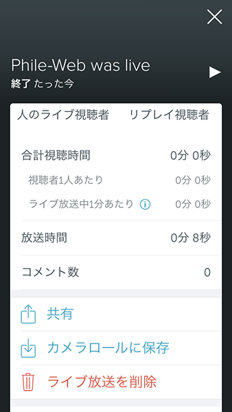 配信が始まると自動的にタイムラインに投稿され、コメントなどを付けることが可能。動画はカメラロールに保存することもできる。ライブ視聴者数やリプレイ視聴者数もチェックできる。