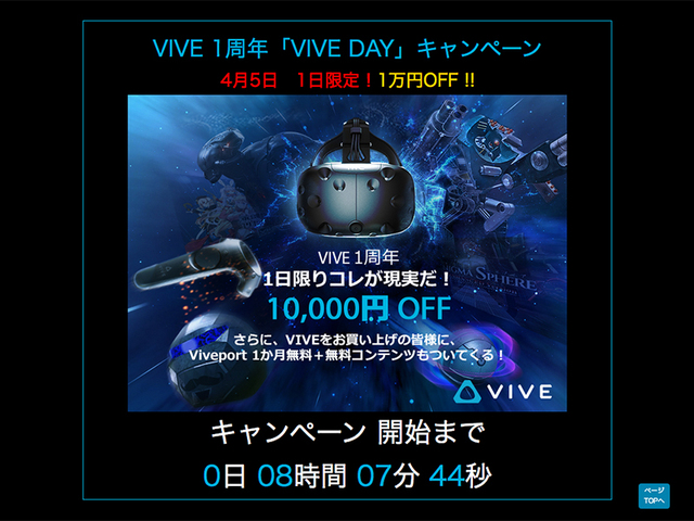 同社の通販サイトでは2017年4月5日(水)の0:00から23:59の間、店舗では同日の営業時間中、「HTC VIVE」を定価99,800円(税抜)から10,000円引きの89,800円(税抜)にて販売する。さらに、購入者には無料コンテンツをプレゼント。