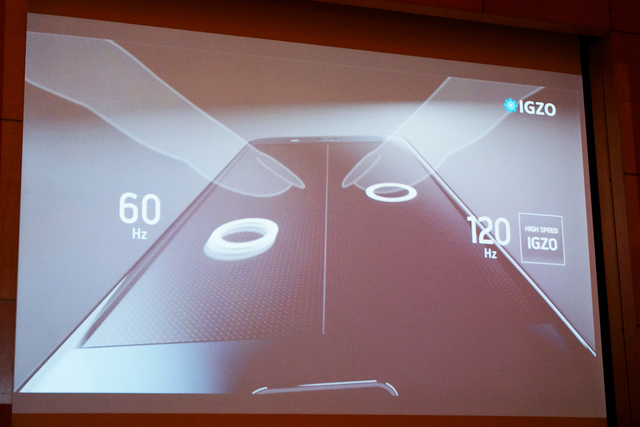 「Reality」について、「AQUOS史上もっとも高精細、なめらかな倍速表示、最高のインカメラを搭載した」という。新モデルには、高い透過率、アイドリングストップによる省エネ、タッチパネルの性能を上げる低ノイズという特性を備えたIGZOディスプレイを進化。解像度をWQHD(2,560×1,440)とし、従来モデルと比較して1.8倍の高精細を実現した。なお画面サイズは5.3インチ。