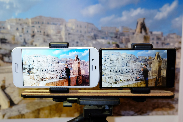 メインカメラは焦点距離約22mm、F1.9の超広角レンズで、解像度は22.6Mピクセル。従来の光学式手ブレ補正に加え、動きながらの撮影に強い電子式手ブレ補正を搭載することで、ブレの少ない写真や動画を撮影することができるという。また、インカメラにも約23mm相当(35mmフィルム換算)、16.3Mピクセルの超広角レンズを搭載する。