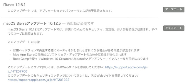 macOS Sierra 10.12.5では、セキュリティや安定性、互換性を高めているほか、USBヘッドホンで再生した際、音声が途切れ途切れになる場合がある問題も修正したと説明している。