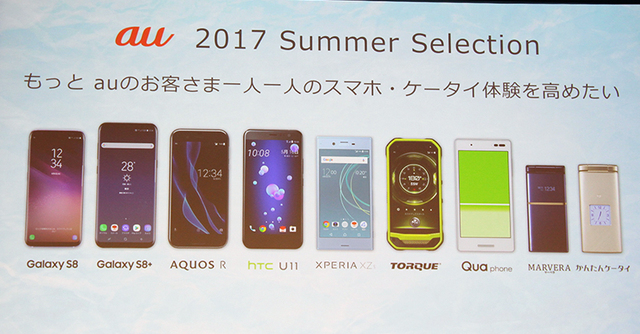 夏の新モデルは合計9機種。スマートフォン「Xperia XZs」「Galaxy S8シリーズ」「AQUOS R」「HTC U11」、auオリジナルモデルの「TORQUE」「Qua phone」の7機種と、auオリジナルの4G ケータイ「MARVERA」「かんたんケータイ」の2機種をラインナップする。