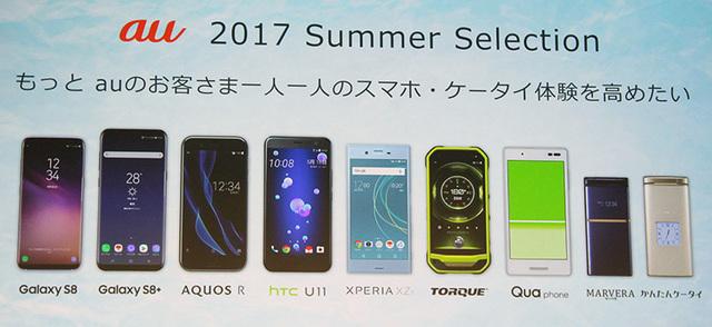 KDDI、沖縄セルラーは、2017年夏モデルの発表会を開催。ベゼルレスデザインの大画面モデル「Galaxy S8/S8+」や、auオリジナルのタフネス設計モデル「TORQUE」などを5月26日から順次発売する。