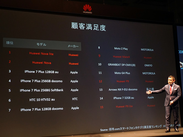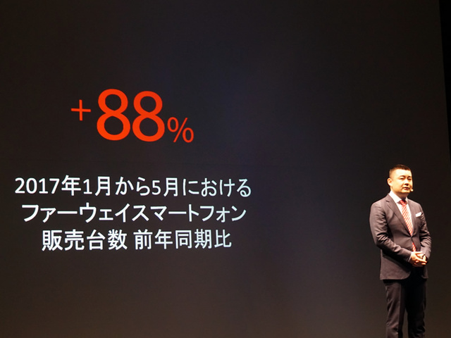そのほか、ファーウェイの呉氏はSIMフリースマホ市場が世界的に急成長しており、同社もその流れに乗ってシェアを伸ばしていることを紹介。9.8%のシェアで世界第3位の地位につけるまでになっていること、国内ではSIMフリースマホ市場のシェアナンバーワンになっており、スマホ全体での4位の地位を獲得していることなどを紹介した。