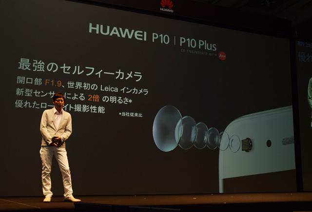 スマホとして世界で初めて、ライカとコラボにしたP10 PlusとP10は、インカメラに従来比で2倍の明るさを持つ新型センサーを搭載。ローライト撮影性能を高めた。発表会ではiPhoneのインカメラよりも明るく、色鮮やかな写真が撮れるスマホであることをアピールした。