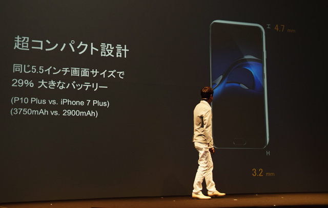 背面はカメラユニットに出っ張りがないデザインとし、さらにP10 PlusはiPhone 7 Plusと同じ約5.5インチのディスプレイを搭載しながら、縦横寸法がよりコンパクトになっていることも比較イメージを比べながらアピールした。