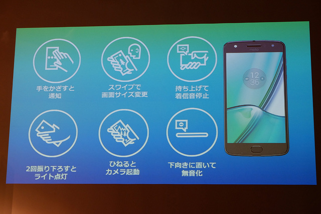 直感的な操作が可能な「motoエクスペリエンス」も強化。手首をひねることでカメラ機能をオンにするなどジェスチャー連携の「Moto Actions」や、夜にスマートフォンを使用するユーザーに向けたディスプレイのブルーライトを低減する機能などを実装した。