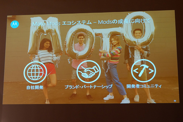 またモトローラ・モビリティ・USAでMoto Modsの開発に携わるクリスチャン・フラワーズ氏も登壇。同社では仕様を外部に公開することで、独自のMoto Modsを開発できるという「Moto Modsエコシステム」を展開しているが、開発キットや認証プログラムも提供されるこのプログラムは今後も継続し、さらなる成長を期待しているとした。