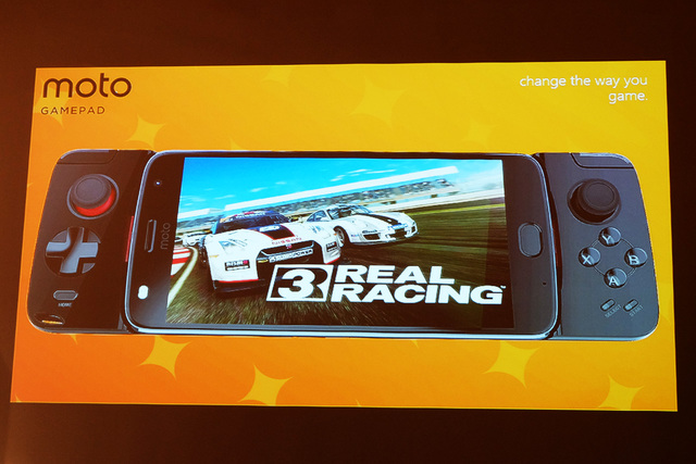 「moto GAMEPAD」についての詳細は発表されなかったが、Moto Zスマートフォンに装着することで、本体をゲームコントローラのように使用できるようになる拡張モジュールであるとしている。