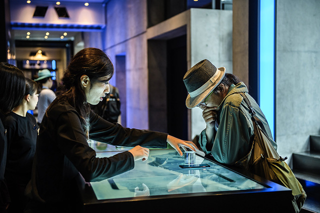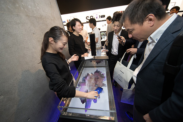 スマートフォンを「インタラクティブテーブル」に置き、テーブル上に表示された製品の主要機能などをタッチスクリーンで操作しながら、スマートフォンの機能や特長を学ぶことができる。