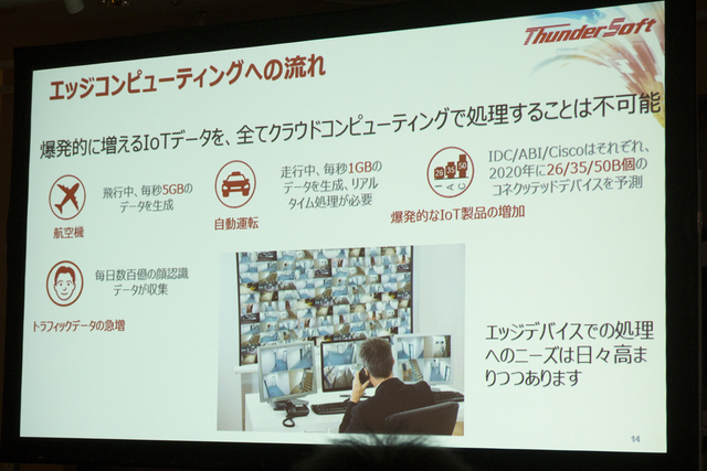 などがモバイル機器との違いと説明。サンダーソフトやArrow Electronics社など他社との協業は、こうした販売・サポート体制など業界の違いに対応する手段の一環と説明していた。