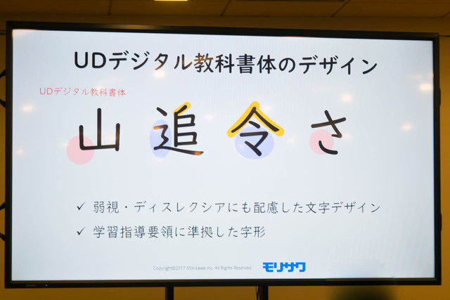 また教育現場の意見を取り入れ、視力や認知能力にハンディのある子どもにも配慮した新フォント「モリサワ UDデジタル教科書体」を採用。日本語の書き文字に近い教科書体と、太くて見やすいゴシック体の特徴を合わせたようなフォントで、ディスプレイ上でも印刷上でも視認性が高いという。