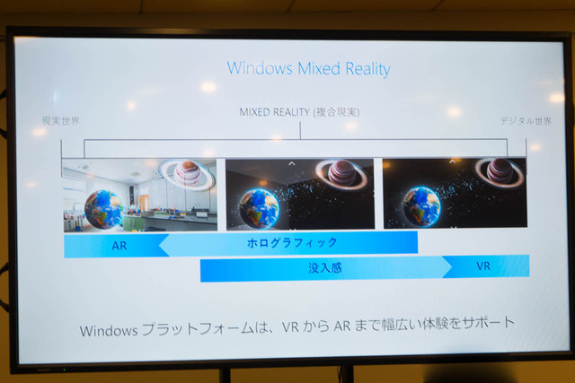 Windows MRは同社が提唱している、ARとVRの中間に位置する「複合現実」プラットフォーム。ゲームのような没入感に浸れるVR的なコンテンツから、マンションの建設予定地で完成予想図を3Dで表示するというAR的な使い方まで幅広くサポートするとしている。