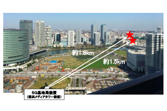 実験は11月13日に、横浜市みなとみらい21地区で実施。39GHz帯の「ミリ波」と呼ばれる高周波数帯を用いて、5Gの長距離伝送に成功した。