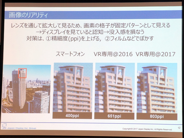 なお、現在世の中に出回っているVR HMD専用機はほぼすべてが有機ELディスプレイを採用しているが、発表会で技術説明にあたった同社の原山武志氏は「液晶ディスプレイ採用端末も複数のメーカーが発表済みで、順次発売される」と状況を説明し、300〜600ppi程度である現在のVR専用機向け有機ELよりも同社開発品が高精細な点などもアピール。
