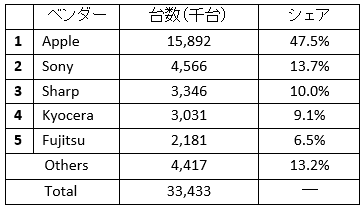 また、通年では、2017年は前年比4.6%増の3,409万台の出荷となり、2016年に続いて2017年も前年比でプラス。ベンダー別シェアでは、アップルが1,589万台(シェア46.6%)でトップ、2位は456.6万台(同13.4%)のソニー、3位は334.6万台(同9.8%)のシャープ、4位は303.1万台(同8.9%)の京セラ、そして5位は271.4万台(同8.0%)の富士通となった。アップルの出荷台数は前年比0.7%減ながらもほぼ同水準を維持しており、「日本国内での圧倒的な存在感が目立つ」と同社は紹介している。