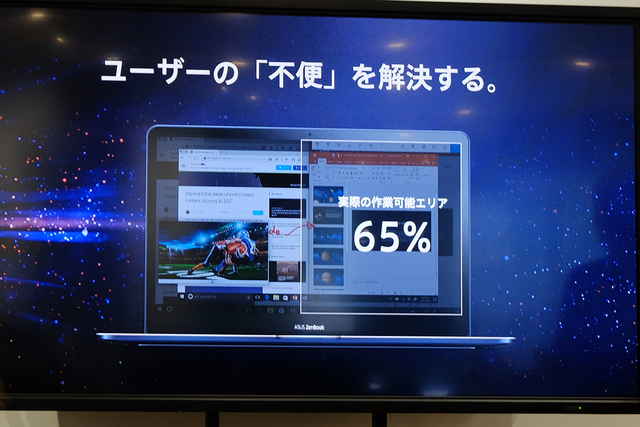 さらに、「高い生産性を求めるときに不便となるのは、ウィンドウを複数開いている際に、実際の作業可能なエリアが65%しかないということ。より快適にマルチタスクが行えないかと考え、ノートPCの限られたスペースを活かすScreenPadを開発した」というScreenPad搭載への経緯が明かされた。