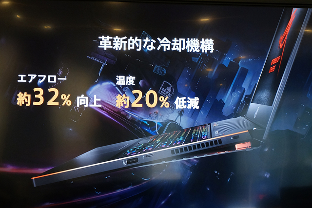 また底面を開く特殊な機構で、エアフローが約32%向上するとともに、温度は約20%低減させることができるという。ディスプレイはリフレッシュレートは144Hz、応答速度は3msを実現した。