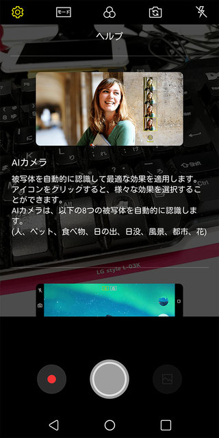 今回のソフトウェアアップデートによってカメラに関する機能を改善。また「AI カメラ」と「Q レンズ」にはThinQ AI機能が搭載される。また、Google アシスタントと連携することにより、写真撮影の操作指示が音声で行えるようになる。LG独自の音声コマンド機能により、「AI カメラを起動して」や「AI カメラで写真撮って」といった指示を認識する。