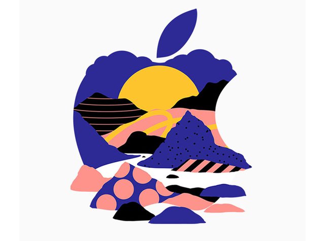 一つは様々な色の、絵の具のようなもので構成されたアップルのロゴマークが表示されている。ほかにも風景を描いたイラストのようなものもあり、今回の発表内容を複数のイラストで示唆していると思われる。また、イベントが開催される場所が、芸術家が多数集まるブルックリンであることも、発表内容に関係していそうだ。