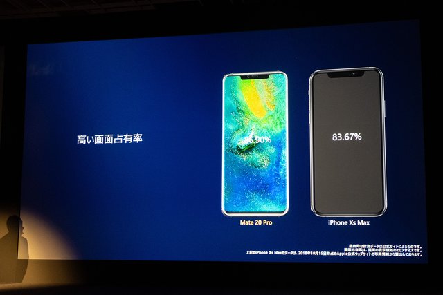 画面専有率は86.90%となっており、これはiPhone XS Maxの83.67%よりも高いと説明、額縁の広さに関しても側面は2.1mm、ノッチの幅は32.8mmとiPhone XS Maxよりも狭いことをアピールされた。