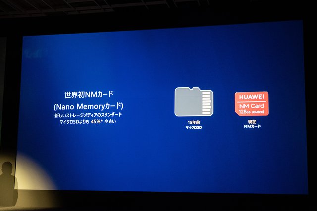 メモリーは6GB、ストレージは128GB。ストレージの拡張はmicroSDよりも45%小型の「NMカード」を世界で初めて採用する。SIMカードはNano SIMを採用、デュアルSIMスロットを搭載しており、1つはNMカードとの共有となる。スピーカーはステレオで、片側はUSB Type-Cポートから音が出る仕組み。